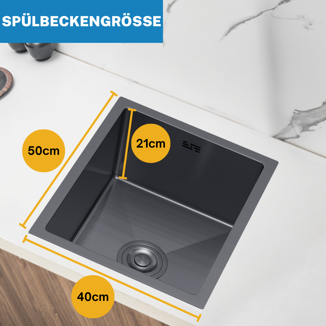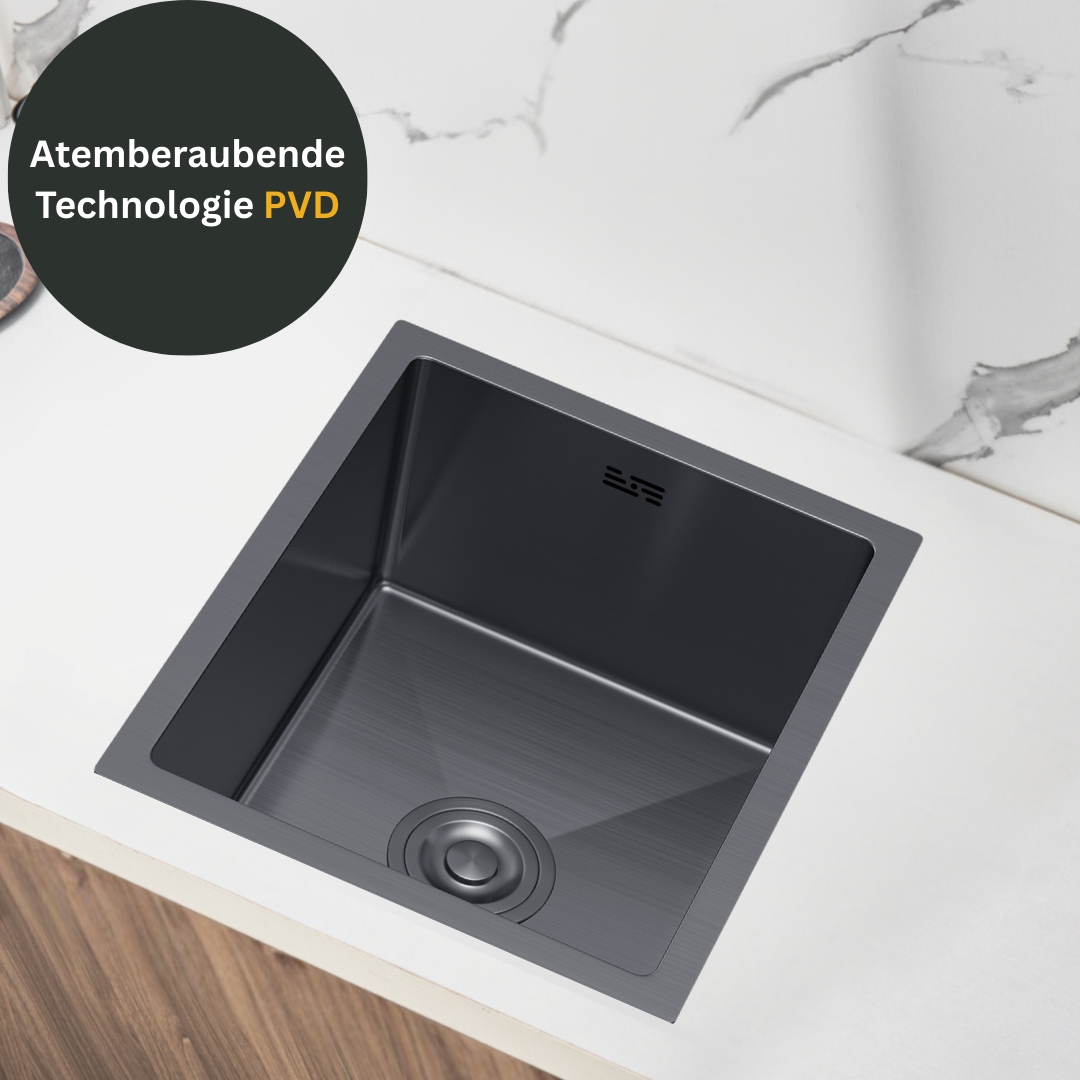 DerEdelstahl-Spülbecken 40x50 Graphit with PVD-Beschichtungist die perfekte Lösung für alle, die moderne Technologie und außergewöhnliches Design schätzen. Dank derreversible montage optionand theerhöhten Widerstandsfähigkeitgegen Abnutzung kombiniert dieses Spülbecken Funktionalität mit einem luxuriösen Look, der Ihre Küche über Jahre hinweg stilvoll bereichert.