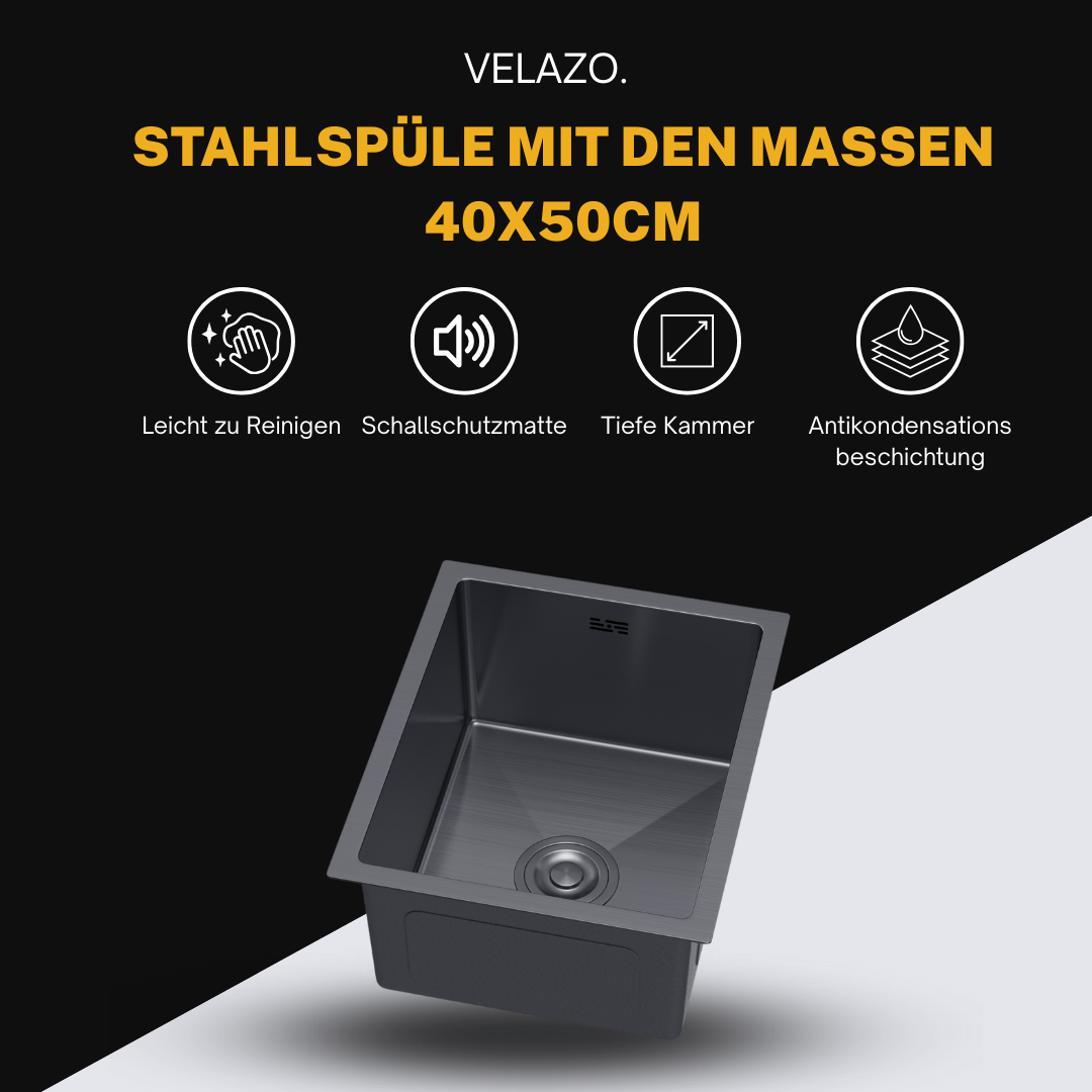 40x50 Stahl-Einzelbeckenspüle ohne Hahnloch, Farbe Graphit, von Velazo.