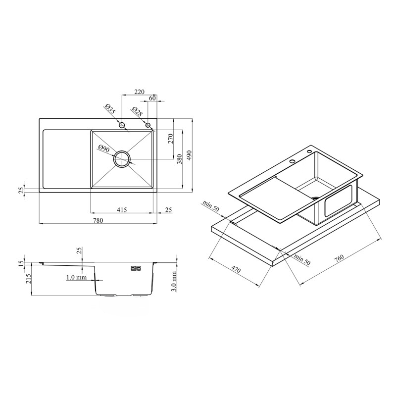 - Abmessungen des Spülbeckens: 780 mm x 490 mm x 210 mm