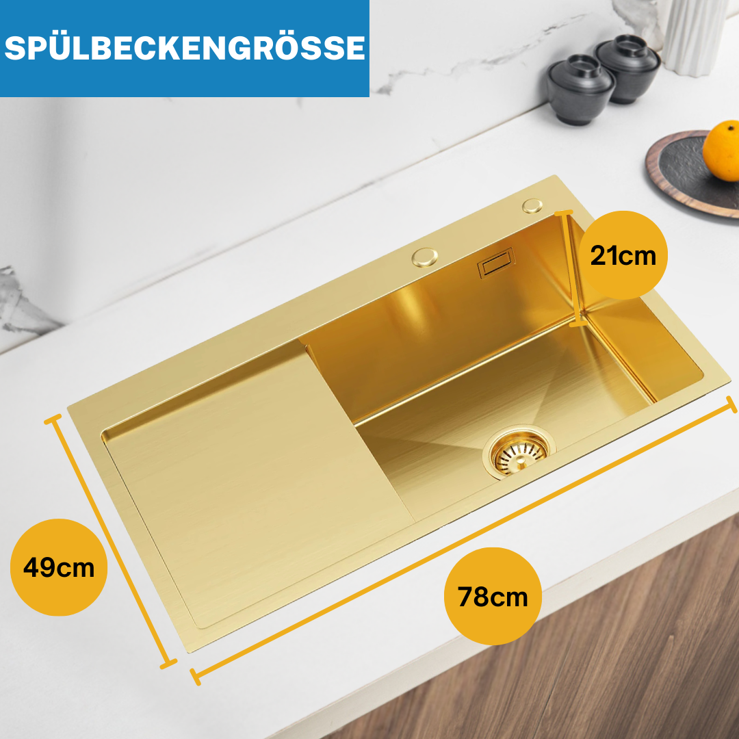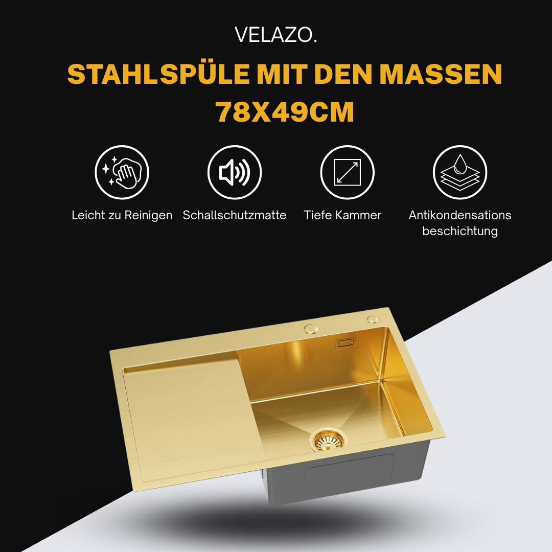 Edelstahl-Küchenspülbecken 78x49 cm Gold PVD mit Abtropfbereich auf der linken Seite von Velazo.