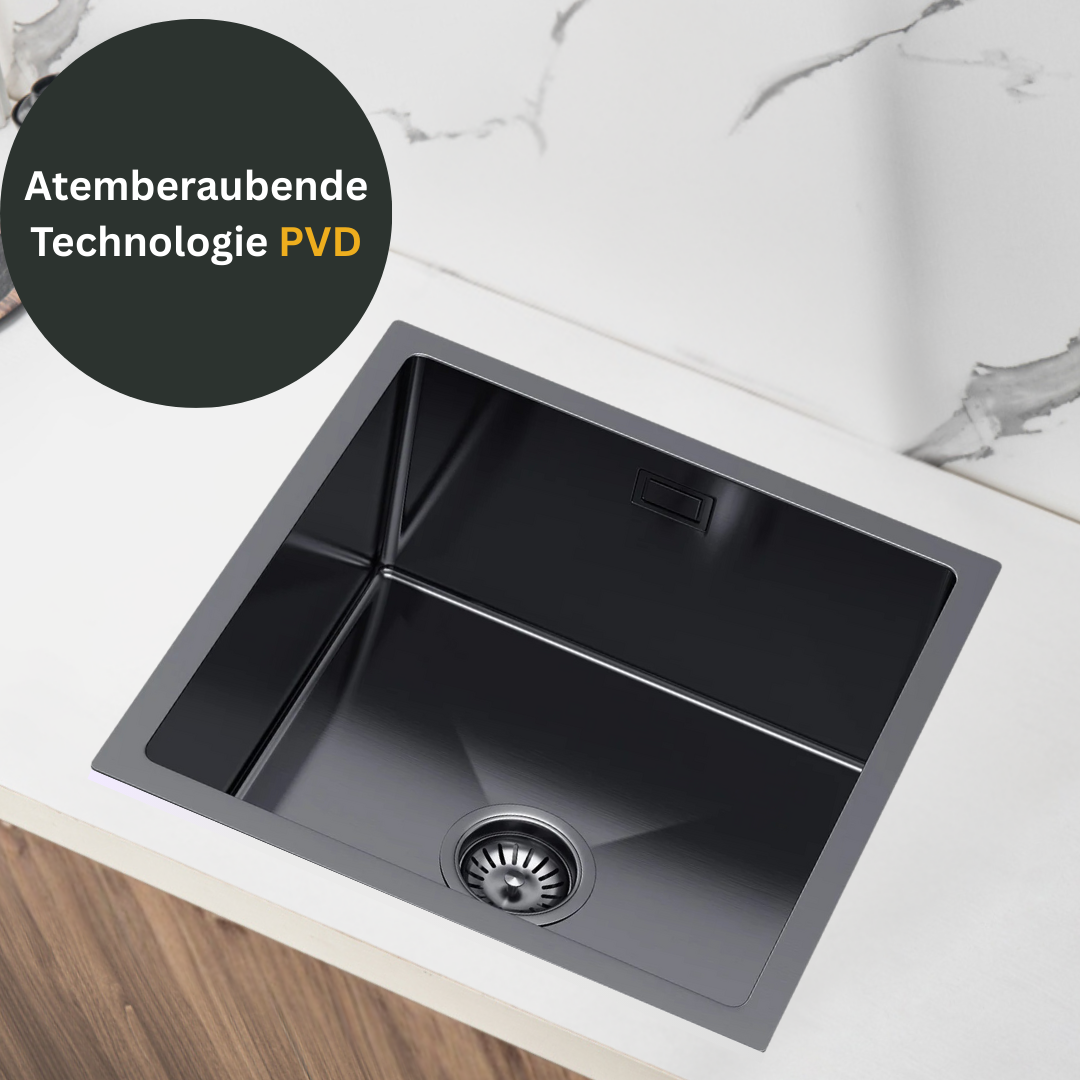 - PVD-Technologie: Die PVD-Technologie (Physical Vapor Deposition) ist ein fortschrittliches Verfahren zum Aufbringen dünner Beschichtungen auf die Oberfläche der Spüle. Dadurch ist die Spüle außerordentlich kratz-, korrosions- und abriebfest. Darüber hinaus ermöglicht die PVD-Technologie ein elegantes Finish in verschiedenen Farben, das die Ästhetik der Küche aufwertet und ihr einen modernen Charakter verleiht.