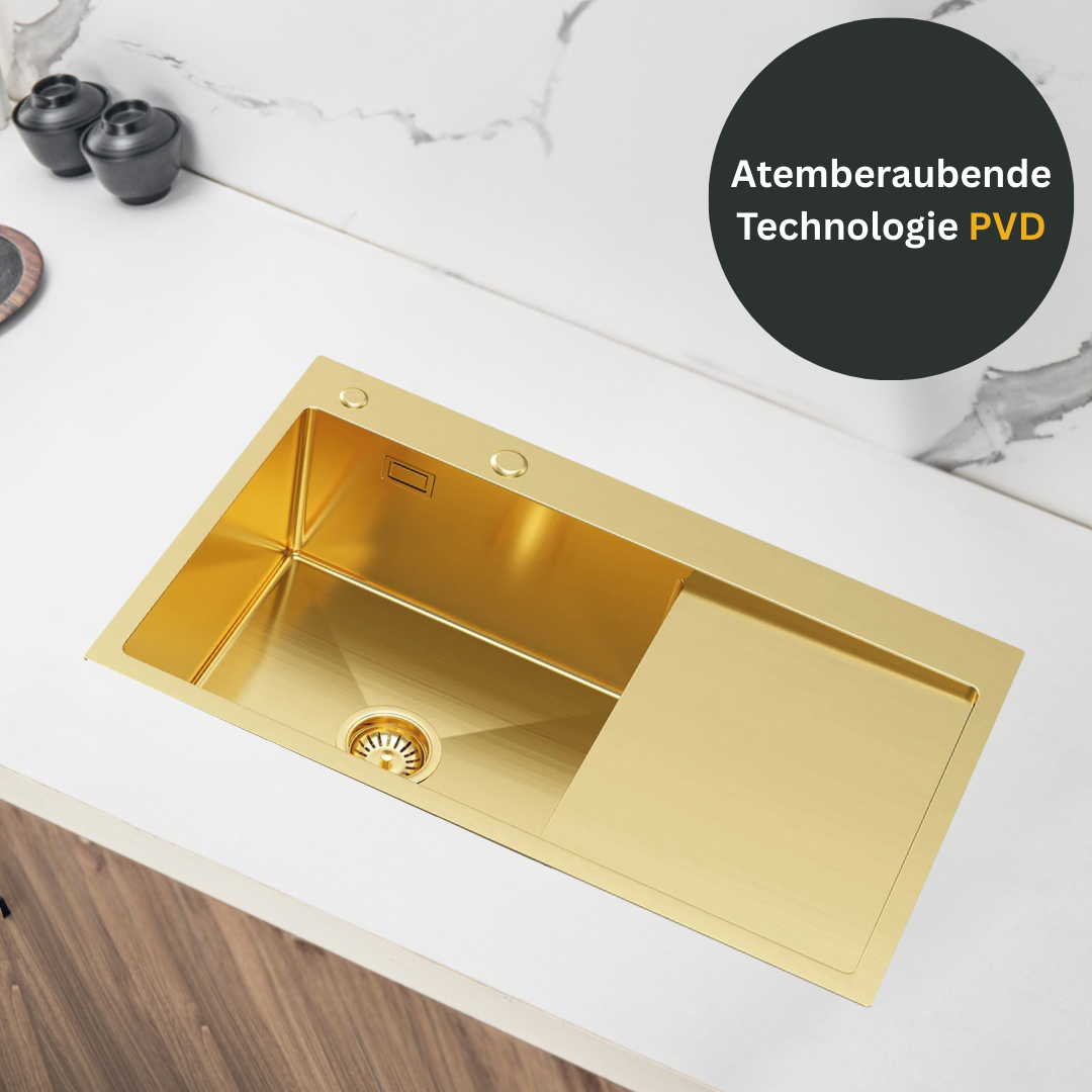 Stahlspüle 78x49 Gold PVD mit Abtropffläche rechts