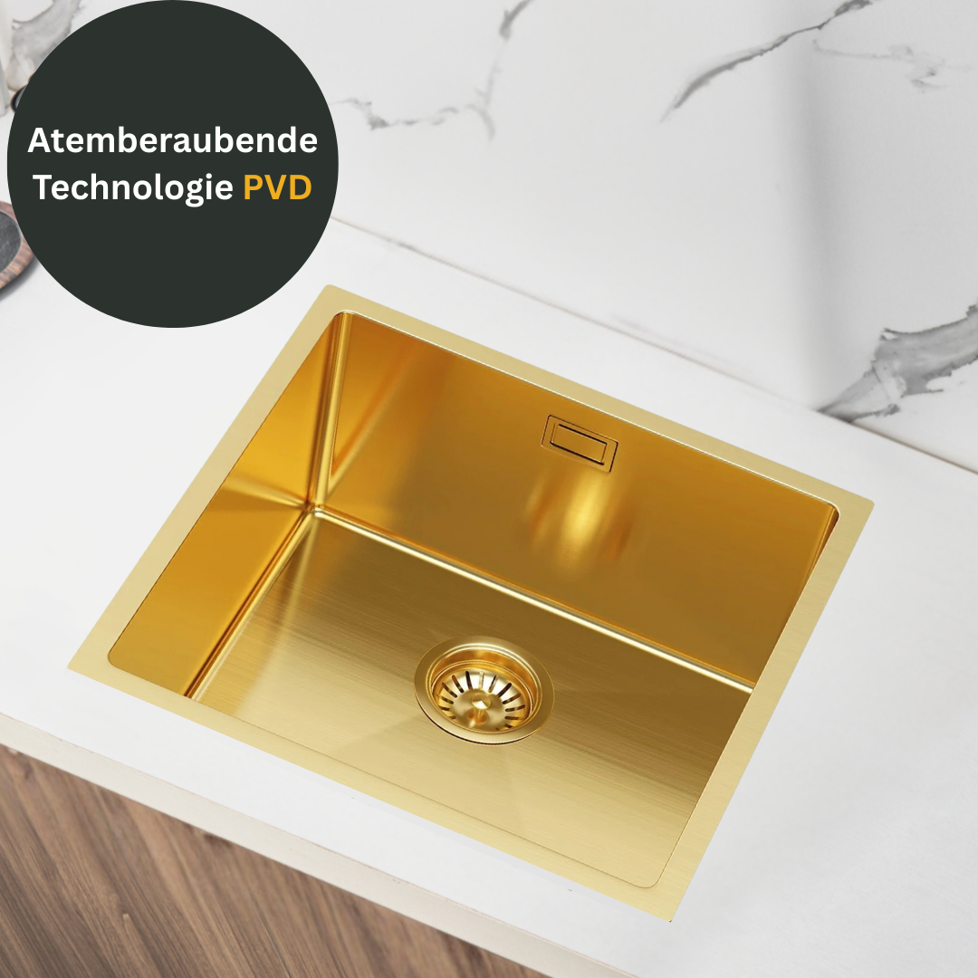 Goldene Einzelspüle aus Stahl, 44 x 44 cm, von Velazo.