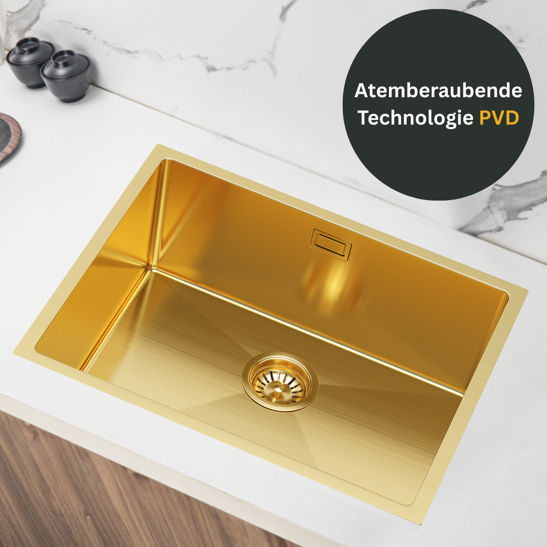 - PVD-Technologie: Die PVD-Technologie (Physical Vapor Deposition) ist ein fortschrittliches Verfahren zum Aufbringen dünner Beschichtungen auf die Oberfläche der Spüle. Dadurch ist die Spüle außerordentlich kratz-, korrosions- und abriebfest. Darüber hinaus ermöglicht die PVD-Technologie ein elegantes Finish in verschiedenen Farben, das die Ästhetik der Küche aufwertet und ihr einen modernen Charakter verleiht.
